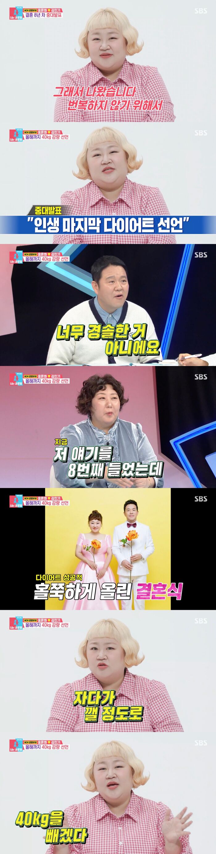 하지만 홍윤화는 번복하지 않기 위해 발표를 할 것이라며 결심했다. 이어 그는 "인생의 마지막 다이어트를 결심하고 나왔다. 중대 발표는 다이어트다"라고 밝혔다.