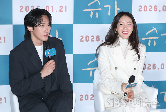 [SBS연예뉴스 | 백승철 기자] 배우 민진웅(왼쪽)과 최지우가 18일 오전 서울 용산구 CGV용산아이파크몰에서 열린 영화 '슈가' 제작보고회에 참석해 토크 시간을 갖고 있다.