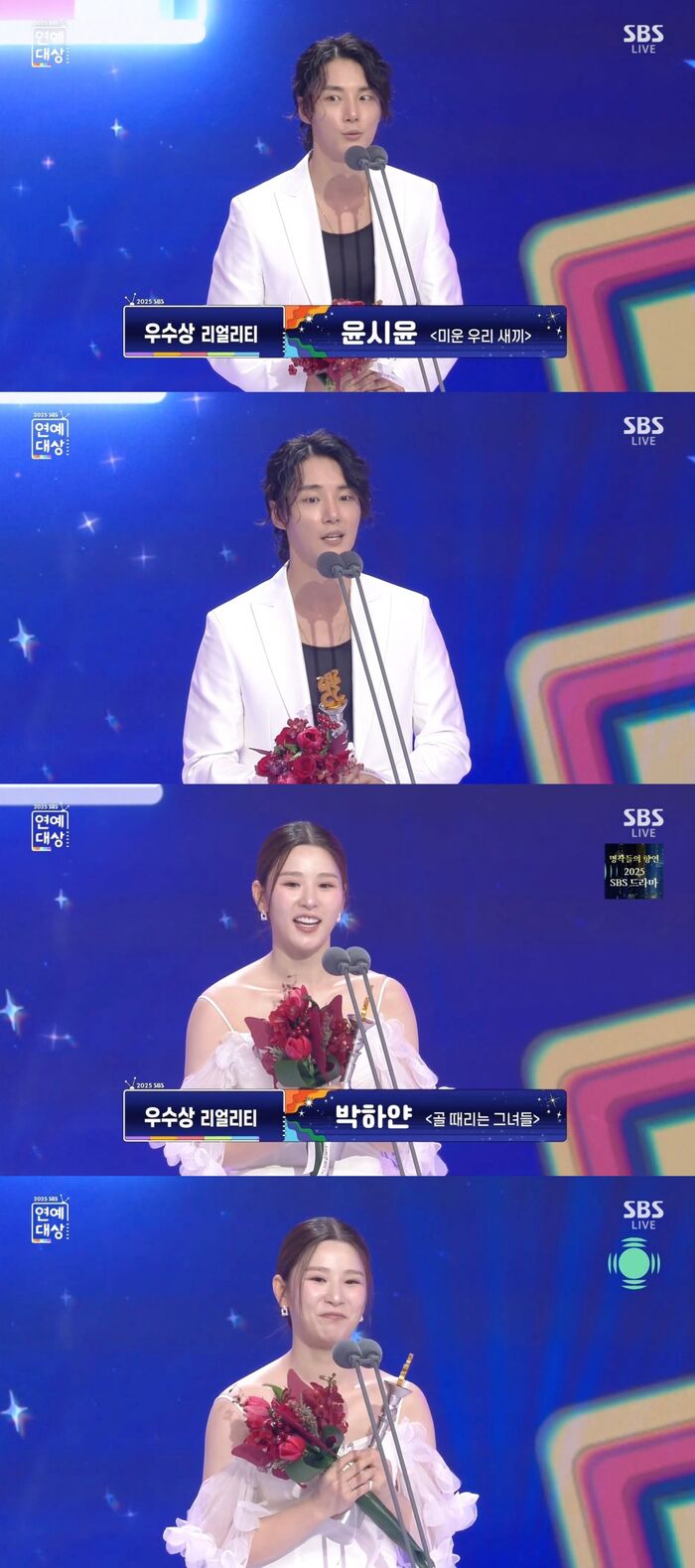 30일 서울 마포구 상암동 SBS 프리즘타워에서 밤 8시 50분부터 생방송으로 진행된 '2025 SBS 연예대상'에서는 윤시윤과 박하얀이 리얼리티 부문 우수상을 수상했다.
