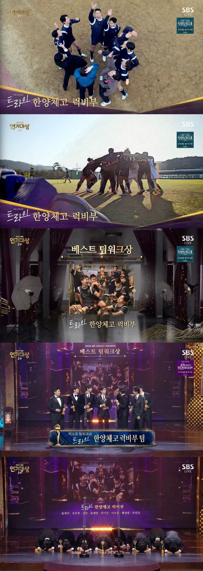 31일 서울 마포구 상암동 SBS 프리즘타워에서 밤 8시 50분부터 생방송으로 진행된 '2025 SBS 연기대상'에서는 드라마 '트라이-우리는 기적이 된다'의 한양체고 럭비부가 베스트 팀워크상을 수상했다.