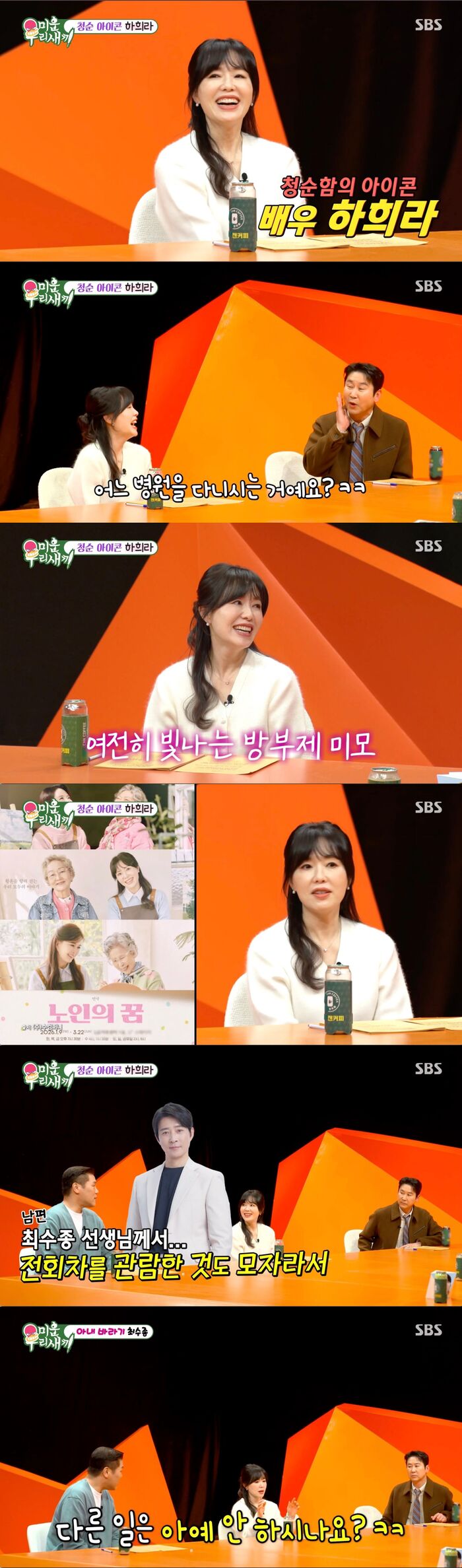 하희라는 "진짜 전회차를 다 보는 게 지루하지 않은지 물었는데 너무 재밌다고 하더라. 나보다 대사를 더 외울 정도로 뭘 틀렸는지도 알고 호흡이 달라진 것도 알더라. 모든 스태프들 중에서도 가장 많이 이 연극을 본 사람이 최수종 씨다"라고 밝혔고, 이에 서장훈은 "지독한 사랑"이라며 진저리를 쳐 웃음을 자아냈다.