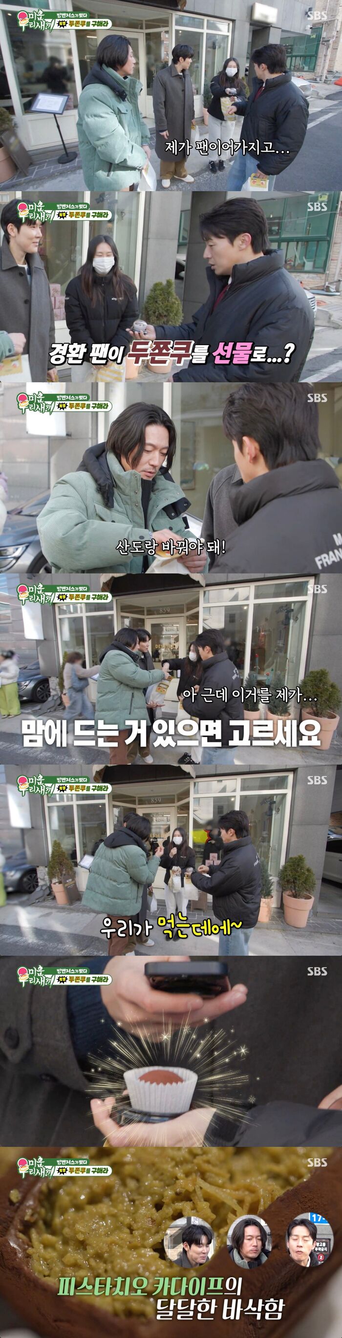 잔뜩 실망한 세 사람 앞에 누군가가 허경환의 어깨 두드리며 등장했다. 이 여성은 허경환을 향해 "팬이어가지고"라며 자신이 구매한 두쫀쿠를 건넸다. 이에 세 사람은 자신들이 구매한 후르츠 산도와 바꾸자고 제안했다.
