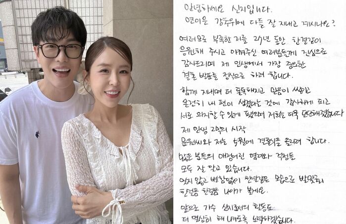 신지는 26일 자신의 소셜미디어에 올린 손편지를 통해서 "여러모로 부족한 저를 27년 도안 한결같이 응원해 주시고 아껴주신 여러분들께 진심으로 감사드리며 제 인생에서 가장 중요한 결혼 발표를 하려고 한다. 제 인생의 2막의 시작 문원 씨와 저는 5월에 결혼식을 올리려 한다."고 밝혔다.