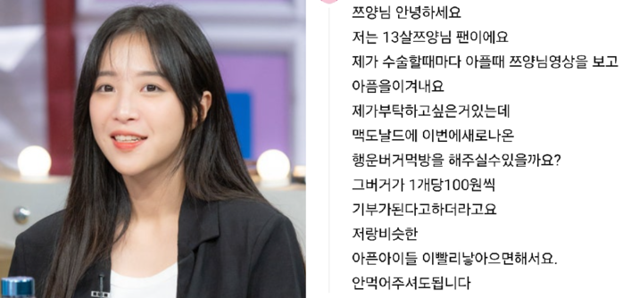해당 구독자는 댓글을 통해 "수술할 때마다 너무 아플 때 쯔양 님의 영상을 보며 버텼다"며 "맥도널드 행운버거 기부 릴레이에 참여해 줄 수 있냐"고 요청했다. 이에 쯔양은 행운버거 10개를 먹는 챌린지 영상과 함께 기부를 약속했고, 실제로 '쯔양과 1,300만 구독자' 명의로 5천만 원을 전달했다.