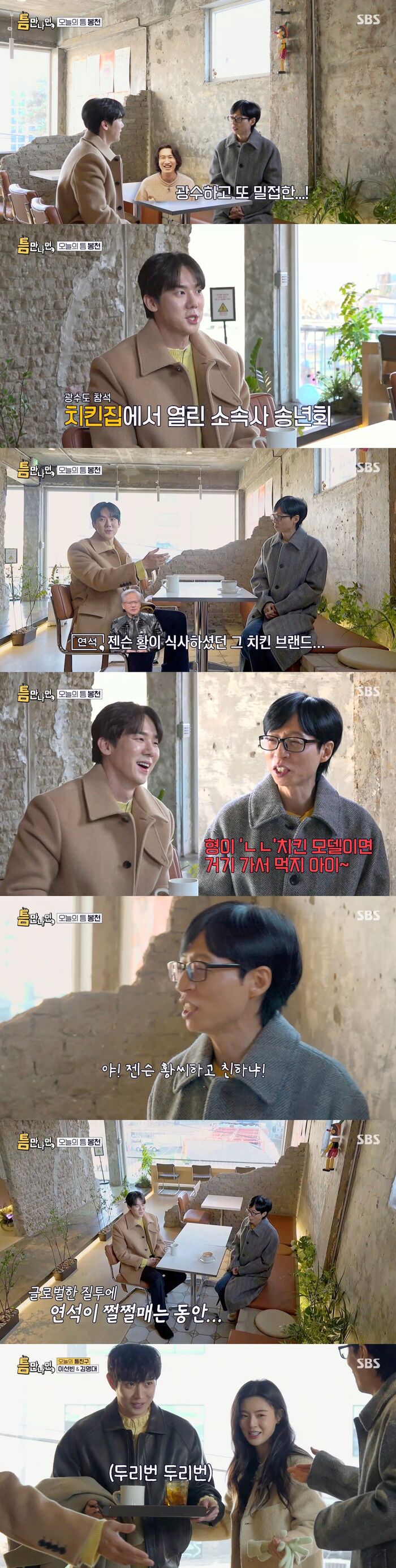 이에 유재석은 "소속사 회식 때 광수 왔어요?"라고 물었다. 그러자 유연석은 "왔어요"라며 "젠슨 황이 식사했던 OO 치킨에서 회식을 했다"라고 답했다.