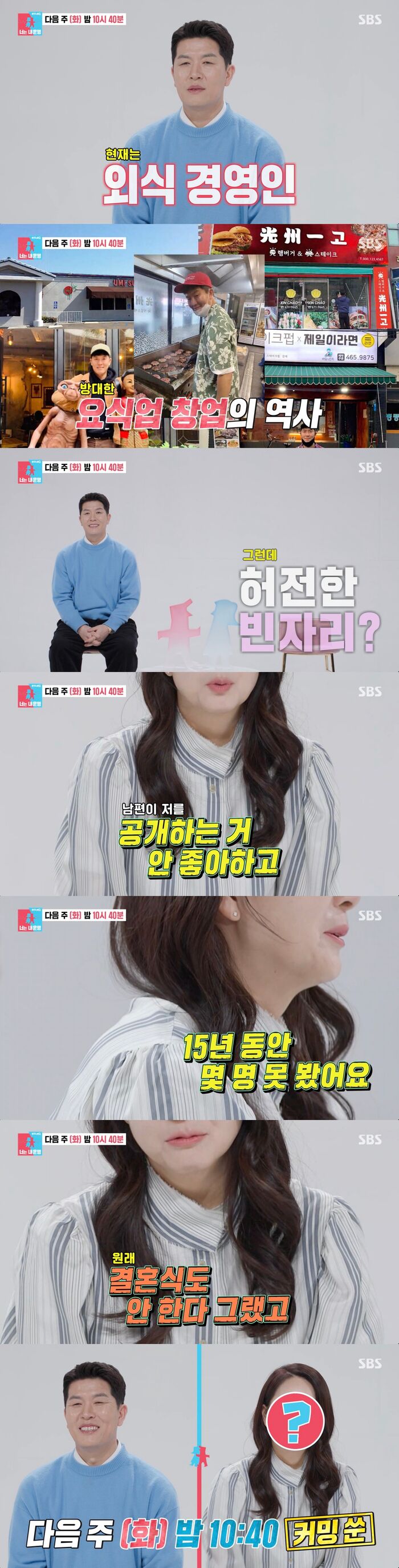 아내는 "남편이 저를 공개하는 것도 안 좋아하고 바깥 이야기도 잘 안 한다. 많은 걸 차단시킨다. 15년 동안 지인 소개도 몇 명 안 했다. 원래 결혼식도 안 한다 그랬다. 그래서 내가 창피한가 다른 사람들도 다 그렇게 사나 싶어 따지려고 나왔다"라고 동상이몽에 출연한 계기를 밝혀 이 부부에게는 어떤 사연이 있을지 궁금증을 자아냈다,