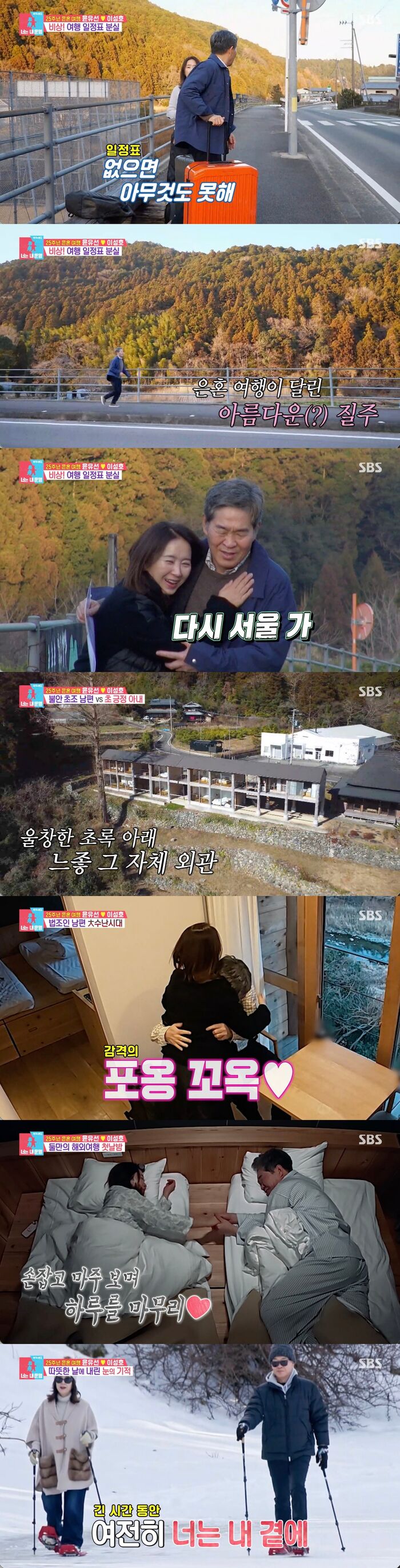 일정표를 찾은 두 사람은 시골길을 따라 숙소로 향했다. 산 아래 통창이 돋보이는 숙소는 두 사람의 마음에 쏙 들었다. 그리고 윤유선은 "수고했어 여보. 무사히 잘 왔어"라며 남편을 안아주었다.