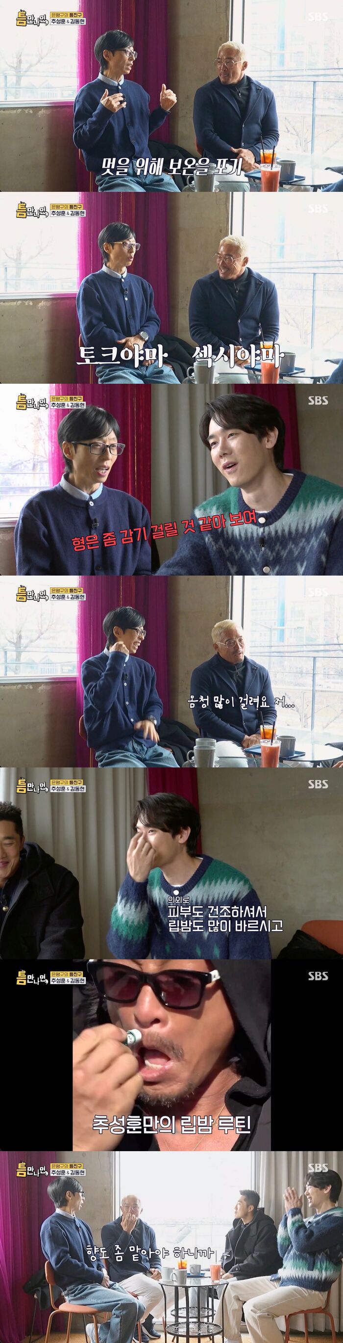 이를 보던 김동현은 "성훈이 형을 20년 봤는데 따뜻하기 위해 입는 옷을 입는 걸 한 번도 못 봤다"라고 말해 눈길을 끌었다.