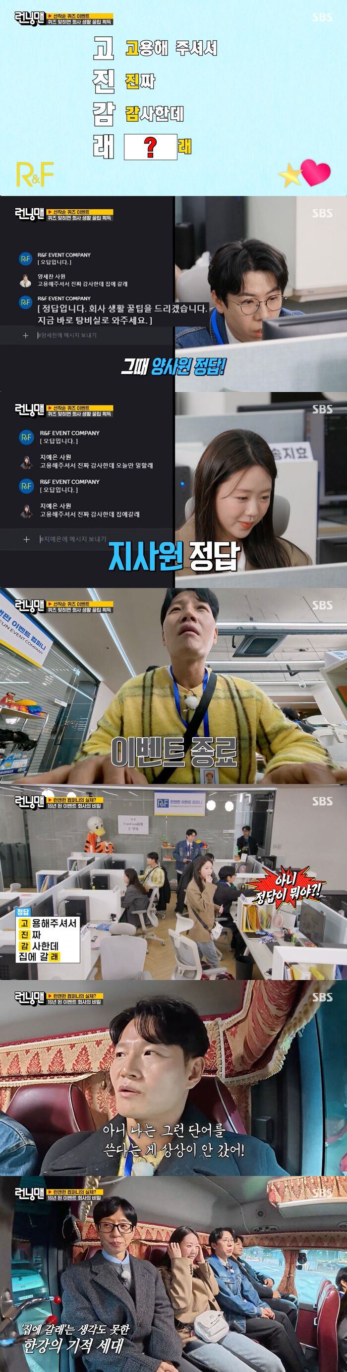 이에 양세찬과 지예은이 "고용해 주셔서 진짜 감사한데 집에 갈래"라는 정답을 맞혔고 탕비실로 호출되어 회사 생활에 유용한 꿀팁을 받았다.