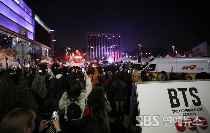[SBS연예뉴스 | 백승철 기자] 21일 오후 서울 광화문 광장에서 'BTS 컴백 라이브: ARIRANG' 공연이 열린 가운데, 시민들이 관람 구역 밖에서 공연을 지켜보고 있다.