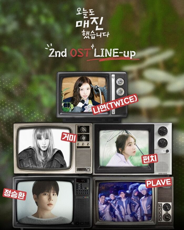 9일 SBS 새 수목드라마 '오늘도 매진했습니다'(극본 진승희, 연출 안종연) OST 제작사 냠냠엔터테인먼트는 "트와이스(TWICE) 나연, 거미, 펀치, 정승환, 플레이브(PLAVE)까지 다양한 장르를 아우르는 아티스트들이 OST 가창에 참여한다"라고 2차 라인업을 밝히며 "각기 다른 음색과 감성을 지닌 아티스트들이 극의 분위기를 이끌 예정이다. 향후 순차적으로 공개될 음원과 함께 드라마의 감동을 더 깊이 느낄 수 있을 것"이라고 전했다.