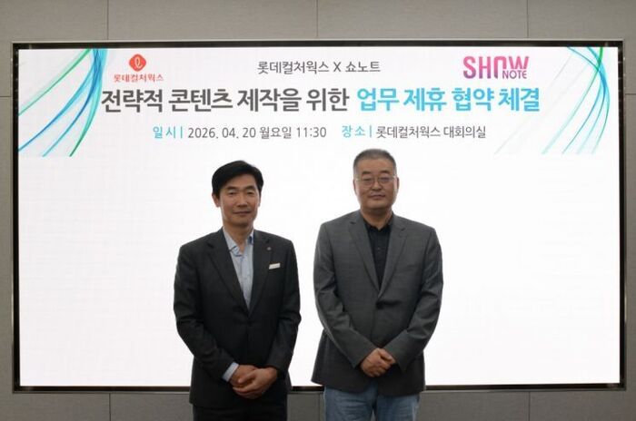 롯데컬처웍스는 지난 20일 쇼노트와 뮤지컬 공동 제작 및 공연 콘텐츠 협업을 위한 업무협약(MOU)을 체결했다. '샤롯데씨어터'를 운영해온 롯데컬처웍스는 이번 협약을 계기로 공연장 운영을 넘어 공연 IP 기획과 제작까지 사업 영역을 확대한다.