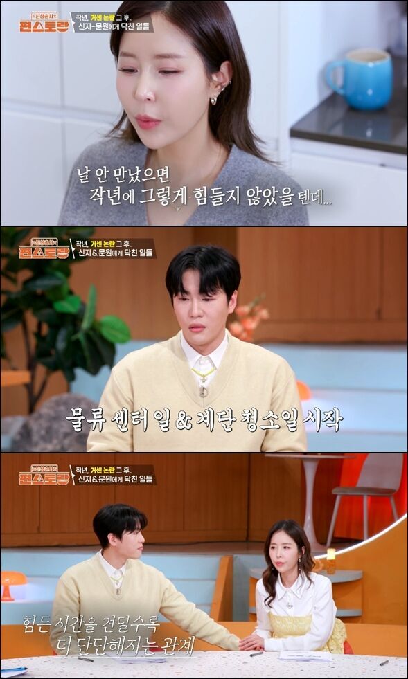 이어 신지는 "날 안 만났으면 작년에 이런 일이 있을 때 이렇게 주목받지 않았을 텐데"라며 미안한 마음을 내비쳤다. 신지는 "(논란 이후) 이 사람이 많이 힘들었다. 그동안 공연도 다니고 축가도 부르러 다녔는데, 그 일들이 뚝 끊겨버렸다"고 전했다.