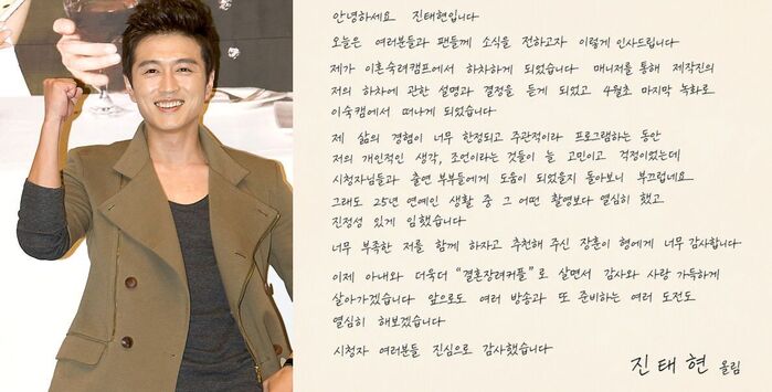 진태현은 28일 오전 자신의 소셜미디어에 자필 손편지를 공개하고 "여러분들과 팬들께 소식을 전하고자 한다. 제가 '이혼숙려캠프'에서 하차하게 됐다"고 밝혔다. 그는 "매니저를 통해 제작진의 하차에 관한 설명과 결정을 듣게 됐고, 4월 초 마지막 녹화를 끝으로 프로그램을 떠나게 됐다"고 전했다.