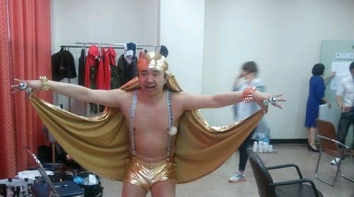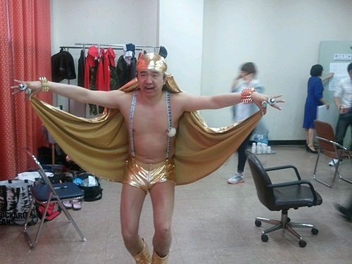 사진 속 박성호는 '개크콘서트' 대기실에서 상의를 탈의한 채 금색 핫팬츠와 멜빵만 착용한 모습. 금색 망토와 두건까지 갖춰 완벽한 황금박쥐로 변신한 박성호는 김영민의 '존경받는 형'이라는 말을 무색케 할 만큼 익살스런 모습이다.