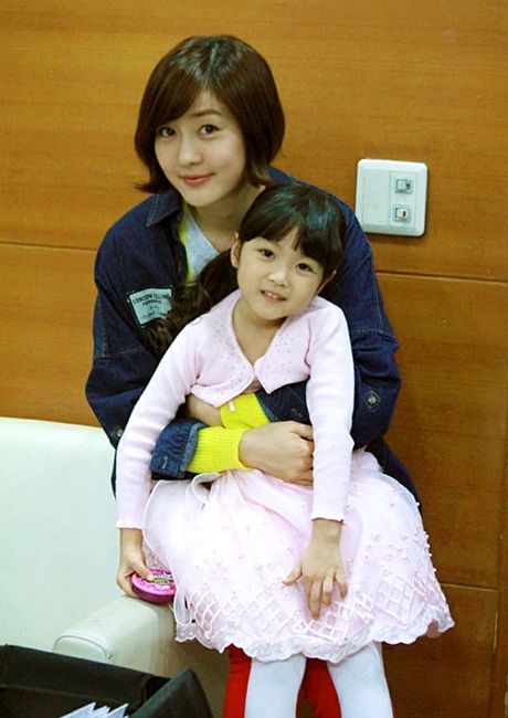 배우 성유리가 MBC 주말드라마 '신들의 만찬' 세트장에서 아역배우와 찍은 사진으로 눈길을 끌고 있다.