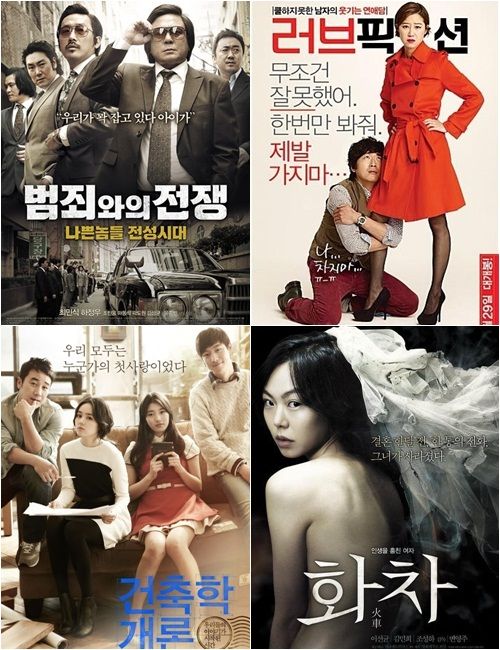 '범죄와의 전쟁'부터 '건축학개론'까지, 파이가 크지 않은 비수기 극장가를 달군  한국영화들이 '사이좋게' 흥행 역시 나눠갖는 분위기다. 네 작품 모두 비교적 중저가 제작비가 든 영화들로 모두 가뿐히 손익분기점을 넘겼을 뿐 아니라 범죄드라마, 로맨틱코미디, 추격 스릴러, 정통 멜로 등 각기 다른 장르의 작품들이라 더욱 시너지효과를 내고 있다는 평이다.