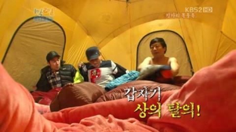 엄태웅과 이수근, 김종민은 텐트당을 설립, 한 명이 야외취침을 하면 모두 밖에서 자겠다며 누드 시위를 벌였다. 김종민은 당 대변인으로 변신해 "여러분의 귀를 속이고 난 그렇게 하기 싫어요"라고 하면서도 "춤을 보고 싶다"는 스태프의 요구에 티아라의 '러비 더비' 춤까지 선보이기도 했다.