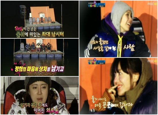 여성 출연자들은 물 한가운데 떠있는 좌대 낚시터에서 낚시체험을 했다. 강 한가운데서 밤낚시를 하며 분위기에 취한 여성 출연자들은 속 깊은 얘기를 나눴다.