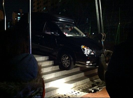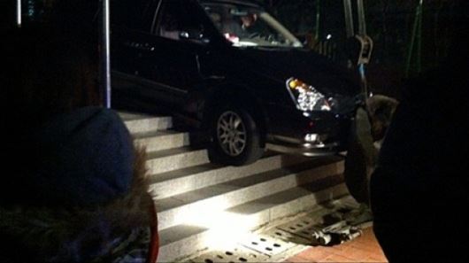 사진 속 박하선의 차는 계단에 아슬아슬하게 걸려있는 모습으로, 매니저로 보이는 운전자가 운전석에 탑승한 채 견인차에 의해 구조 되고 있다.
