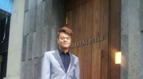 사진 속 박진영은 말끔히 정장을 차려 입고 '크리스탈벨리(KRISTAL BELLI)'라고 씌여 있는 레스토랑 현관 앞에 서있다.