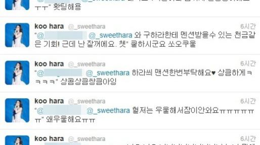 구하라는 팬들의 글에 일일히 화답하며 "저는 우울해서 잠이 안 와요"라는 팬에게는 "왜 우울해요"라며 위로를, "하라 씨, 멘션 한 번 부탁해요"라는 글에는 "상콤상큼쌍큼 아잉"이라며 애교를, "와, 구하라한테 멘션 받을 수 있는 천금같은 기회. 하지만 난 잘거에요 쳇"이라는 글에는 "쿨하시군요"라며 시크한 매력을 뽐냈다.