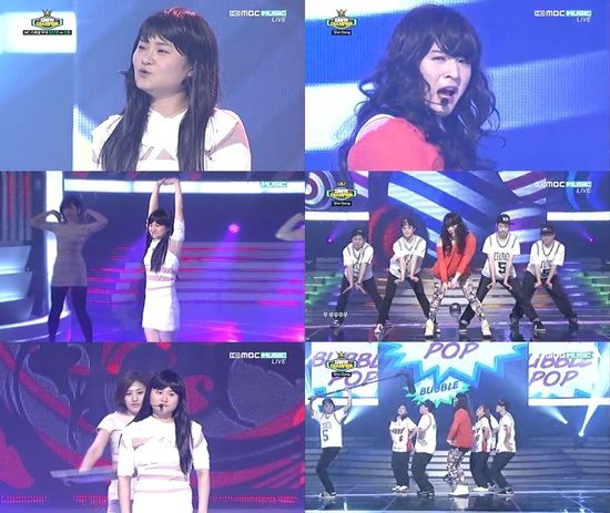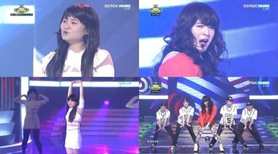 지난 27일 방송된 MBC 뮤직 '쇼 챔피언'에서 MC 김신영은 신동과 함께 각각 미쓰에이의 붕대의상과 포미닛 현아의 하의실종 의상을 소화했다.