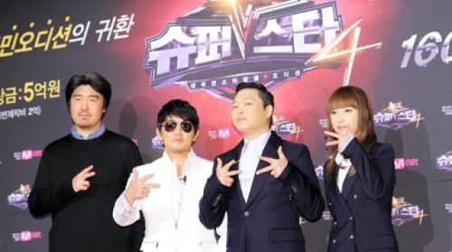 [SBS SBS연예뉴스 l 김현철 기자] 김기웅CP, 가수 이승철, 싸이, 김태은PD가 28일 오전 서울 삼암동 CJ E&M센터에서 열린 Mnet'슈퍼스타K4' 기자간담회에서 포즈를 취하고 있다.