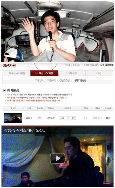 이어 지난 15일에는 '슈퍼스타K4' 공식 홈페이지에는 강용석이 뮤지컬 '지킬 앤 하이드'의 곡 '지금 이 순간'을 열창하는 UCC 영상이 공개돼 화제가 됐다.