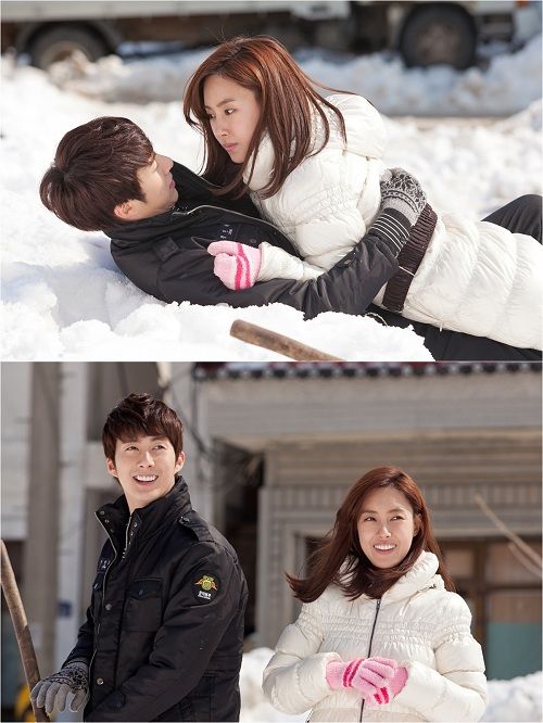 눈부실 만큼 하얀 눈 위에 두 사람이 포옹을 하고 있는 모습은 이제 막 사랑을 시작하는 연인 포스를 풍기며 마치 러브스토리 속 한 장면을 연상케 해 많은 관심을 모으고 있다. 특히 두 사람이 약간은 어색한 표정으로 서로를 바라보고 있는 모습은 묘한 핑크빛 기류까지 느껴져 질투심을 유발하며 시선을 사로잡고 있다.