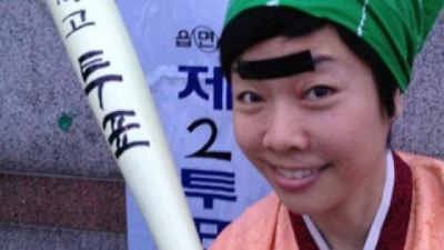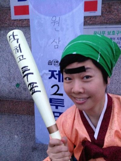 사진 속 김미화는 과거 인기를 모았던 코미디 코너 '쓰리랑부부' 복장을 하고 있다. 한복을 입고 머리에는 두건을 두른채 한 손에는 "닥치고 투표"라고 씌여진 야구방망이를 들고 있다. 뿐만 아니라 눈썹에는 검은색 테이프를 붙여 일자눈썹을 만들었다.