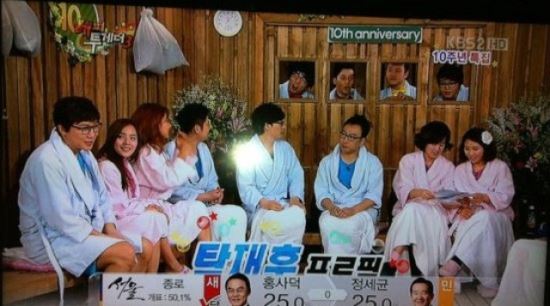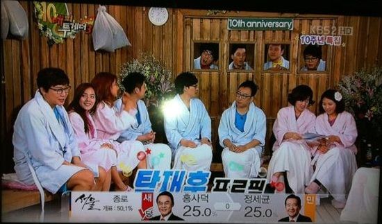 11일 오후 4시 경 방송된 '해피투게더' 재방송에서는 화면 하단에 '서울 종로 개표 50.1%, '당' 홍사덕 25.0%, 정세균 25.0%'라는 내용의 자막이 그대로 송출됐다.