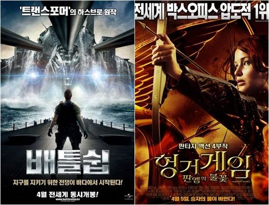 두 외화 화제작 '배틀쉽'과 '헝거게임'가 국내에서 흥행 온도차를 보이고 있다. 지난 5일 개봉한 '헝거게임'은 11일까지 전국 42만 5164명을 모으며 박스오피스 5위를 기록했다. 북미에서 3주연속 박스오피스를 '올킬'시키며 수익 3억달러를 돌파, 신기록을 세워나가고 있는 현지 분위기와는 사뭇 다른 '미지근한' 반응이다.