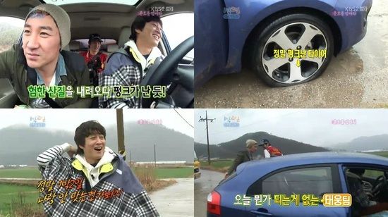이날 잡고 잡히는 추격전을 벌이던 태웅 팀은 미션 장소 중 한 군데인 흑염소 목장으로 향했다가 자동차 타이어에 펑크가 나는 사고를 겪었다. 뒤를 따르던 담당 PD가 무전을 통해 "타이어에 펑크가 났다"고 알려준 것. 안 그래도 바쁜 추격전 가운데 타이어에 펑크까지 났다니 엄태웅과 차태현 주원, 세 사람은 허탈함을 감추지 못했다.