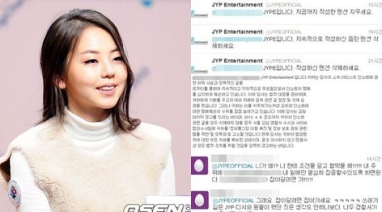 JYP엔터테인먼트는 17일 "해당 네티즌의 글이 심각하다고 판단, 지난 16일 A씨에 대해 정보통신망 이용 촉진 및 정보 보호 등에 관한 법률 위반 및 모욕죄로 고소장을 제출했으며, 17일 진술 조사를 진행했다"고 밝혔다.