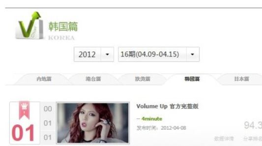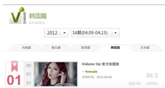 포미닛은 지난 9일에 발표된 미니 3집 타이틀곡 '볼륨업'으로 중국 최대 뮤직비디오 사이트 인웨타이(www.yinyuetai.com)에서 한국 차트 주간 1위를 차지했다.