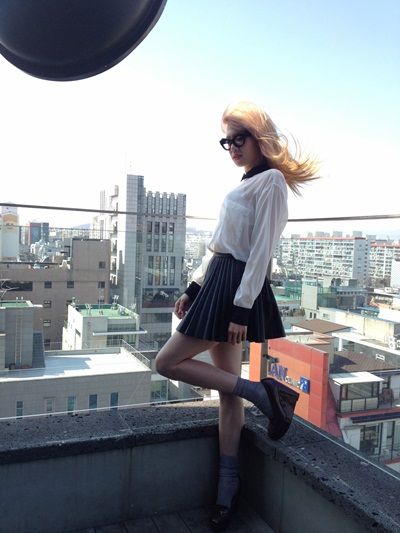 공개된 사진 속에는 미가 빌딩 옥상에서 금발의 긴 머리를 휘날리고 있다. 미는 한 다리를 들어 올리고 '학다리' 포즈를 취하고 있다. 흰 블라우스에 검정 주름치마를 코디해 세련된 매력을 선보였다. 특히 금방 부러질 듯한 얇은 다리는 마네킹을 연상시켰다.