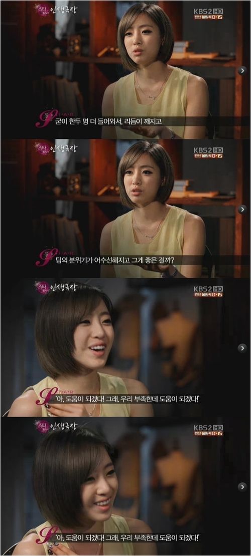 은정은 12일 방송된 KBS 2TV '스타인생극장'에서 새 멤버 충원에 대해 “솔직히 처음에는 '왜? 우리가 부족한가' 싶었다”면서 “만약에 우리가 실력이 부족하면 연습하면 된다고 생각했다”고 말했다.