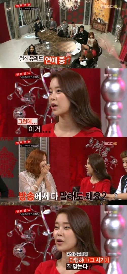 이에 방송인 김나영은 "그렇다면 절친인 유리씨와 지혜씨도 현재 백지영씨처럼 애인이 있냐"고 물었고 백지영은 담담하게 "유리는 있고 지혜는 있었는데 얼마전 헤어졌다"고 말했다.