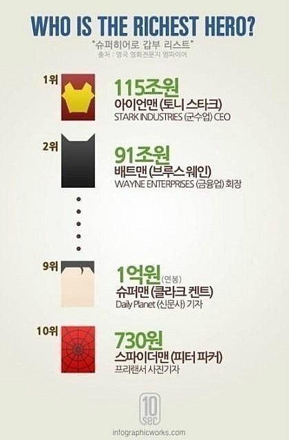 최근 한 온라인 커뮤니티에는 '슈퍼 히어로 재산 순위'라는 게시물이 등장했다. 해당 게시물은 영국 영화 전문지 엠파이어를 출처로 1위부터 10위까지 슈퍼 히어로 갑부 순위를 매겼다.