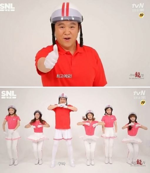 이날 김구라는 크레용팝의 무대 의상인 빨간색 주름치마와 흰색 레깅스, 헬맷을 그대로 착용한 후 일명 '구라용팝'으로 깜짝 변신했다.