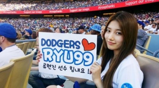 특히 이날 수지는 응원을 위해 LA 다저스의 스냅백을 착용, 직접 준비한 플래카드로 류현진을 응원해 관심을 모으고 있다.