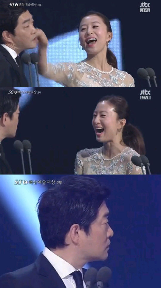 이날 시상에서 손현주는 "김희애 씨는 최근 드라마 '밀회'에서 유아인 씨와 호흡을 맞췄다. '우아한 거짓말'로 영화에도 복귀 하셨다"며 김희애의 최근 활약상을 언급했다.