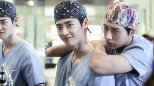 이 사진은 27일 방송된 8회에서 박훈(이종석 분)과 한재준(박해진 분)의 불꽃 스파크가 튀었던 수술준비실 촬영이 이뤄졌을 당시 모습. 하지만 극에서 느껴졌던 날선 긴장감이 전혀 느껴지지 않는다.