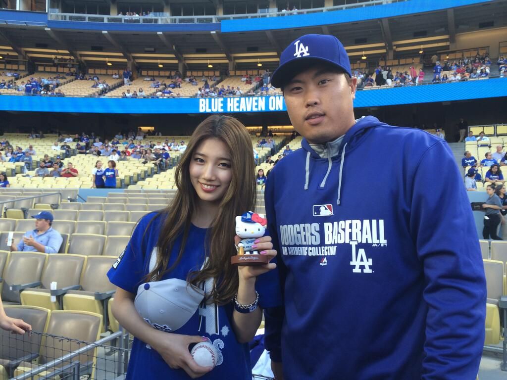 이날 푸른 색에 다저스 로고가 박힌 티셔츠에 데님 팬츠, 스냅백 차림으로 등장한 수지는 시구에 임하기 전 덕아웃에 들러 야시엘 푸이그, 디 고든, 후안 유리베 등 류현진의 동료 선수들과 인사를 나누며 기념 촬영을 하는 시간을 가졌다.