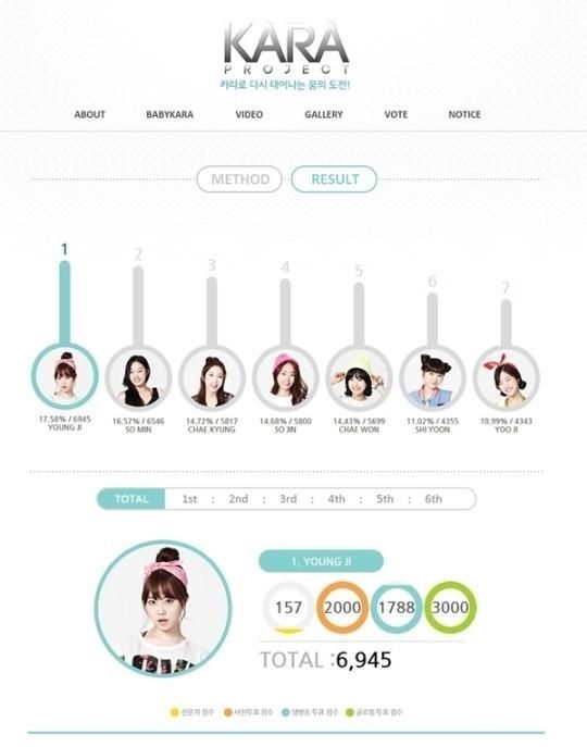 3일 '카라 프로젝트-카라 더 비기닝' 공식 홈페이지에는 베이비카라 7명의 멤버 소진, 시윤, 영지, 채경, 소민, 채원, 유지의 첫 미션 투표 결과가 공개됐다.