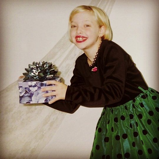 사진 속 아만다 사이프리드는 금발 머리에 빨간 립스틱을 바르고 선물을 들고 있으며, 살짝 돌출된 앞니가 눈길을 끌고 있다.