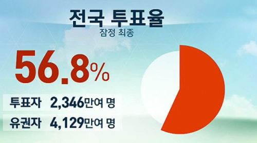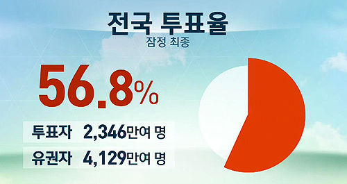 중앙선관위는 잠정집계 결과, 전체 유권자 4천 129만여 명 가운데, 2천 346만여 명이 투표해서 투표율이 56.8%라고 밝혔다.