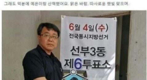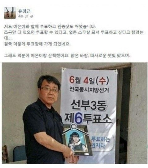 그가 게재한 인증샷 속에는 투표소 앞에서 유씨가 딸 예은 양의 영정 사진을 끌어안고 서 있는 모습이 담겨있어 보는 이들로 하여금 가슴 한 켠을 먹먹하게 만들고 있다.