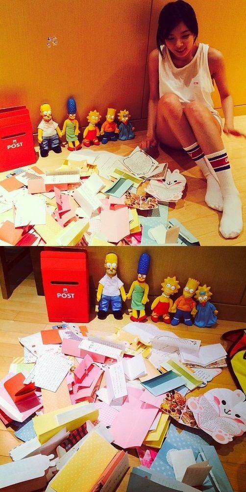 공개된 사진 속 포미닛 현아는 수북하게 쌓인 편지 더미에서 행복한 미소를 짓고 있다.